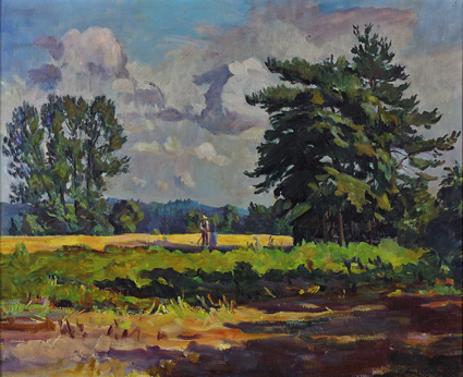 Bäuerin und Bauer auf dem Kornfeld, um 1950
