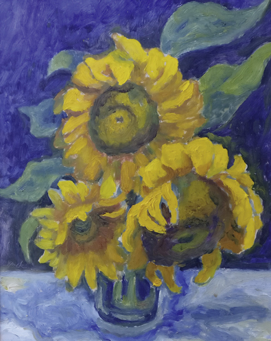 Wolf-Dietmar Stock, Sonnenblumen in Glasvase, 2021, Öl/Hartfaser