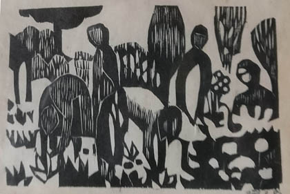 Werner Zöhl, Bei der Gartenarbeit, 1982, Holzschnitt