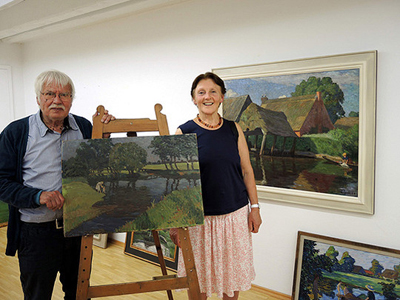 Die Vorbereitungen sind praktisch abgeschlossen, da sorgt ein Anruf von Duncan Mattis für zusätzliche Vorfreude. Der Mann aus München hatte sich an die Rotenburger Rundschau gewandt, die er im Internet ausfindig gemacht hatte. Er teilte mit, dass er ein Bild von einem Maler Rohmeyer auf seinem Dachboden gefunden habe und wollte wissen, ob die Rundschau einen Ansprechpartner vermitteln könnte. Umgehend wurde der Kontakt zu Wolf-Dietmar Stock hergestellt. der Vorsitzende des Kunstvereins machte sich gleich an die Recherche. „Rohmeyer hat in München studiert und auch seine Frau kommt aus der Gegend. Ein Werk mit dem Titel Sommertag gibt es bereits, ein weiteres könnte Rohmeyer später gemalt haben“, meint Stock. Oft sei es so, dass nachfolgende Generationen mit den Werken nicht mehr viel anfangen können und sie in der Versenkung verschwinden. Der Münchener Mattis sagte zu, das Bild per Paketdienst nach Fischerhude zu versenden, ohne Rahmen, denn den wird Benjamin Rohmeyer, seines Zeichens Tischler und Urenkel des Malers mit Wohnsitz in Fischerhude, anfertigen. Natürlich soll das Exponat die Ausstellungseröffnung als I-Tüpfelchen schmücken. Die Frage, ob das Bild noch rechtzeitig eintreffen wird und ob es sich tatsächlich um ein Original handelt, konnte erst am Donnerstagabend beantwortet werden – und zwar bei einem Treffen in Buthmanns Hof, dem Veranstaltungsort, wo auch Ruth Rohmeyer, Mutter Von Benjamin, zugegen war. Noch verpackt lag das Bild auf dem Tisch in der Galerie. Vorsichtig befreite es Stock aus dem Papier. Zum Vorschein kam tatsächlich ein Original. Handschriftlich hatte derKünstler auf der Rückseite den Titel Sommertag fixiert. „Das Bild muss mal in einem Raucherzimmer gehangen haben, denn die Farben sind sehr dunkel geworden“, so die erste Einschätzung über den Zustand. Auch hat es einige kleine Macken. Dass konnte die Freude über den aufgetauchten Schatz aber nicht schmälern. Ruth Rohmeyer und Wolf-Dietmar Stock waren gleich in ein Gepräch vertieft, um herauszufinden, wer die dargestellten Personen (Mutter und Kind) auf dem Bild sind und wo der idyllische Platz sein könnte, den der Künstler einst in seinem Werk festgehalten hat.